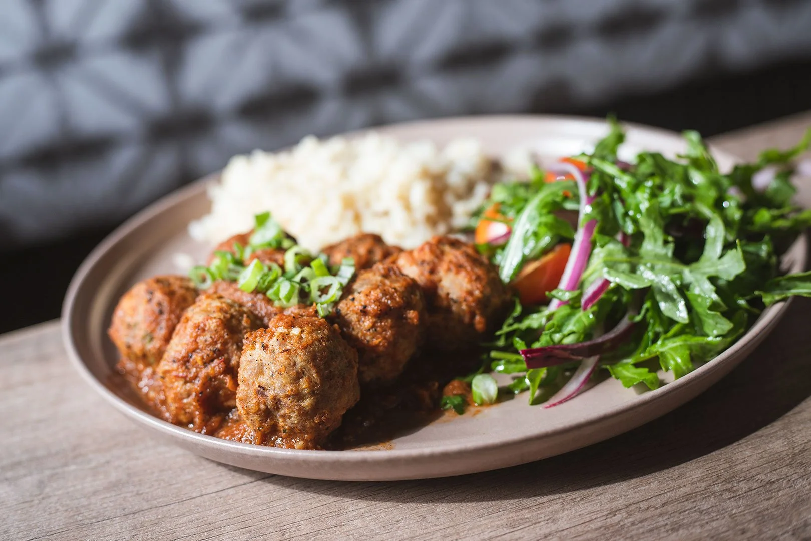 pork & beef meatballs, chipotle-charred tomato sauce, arugula salad, white rice