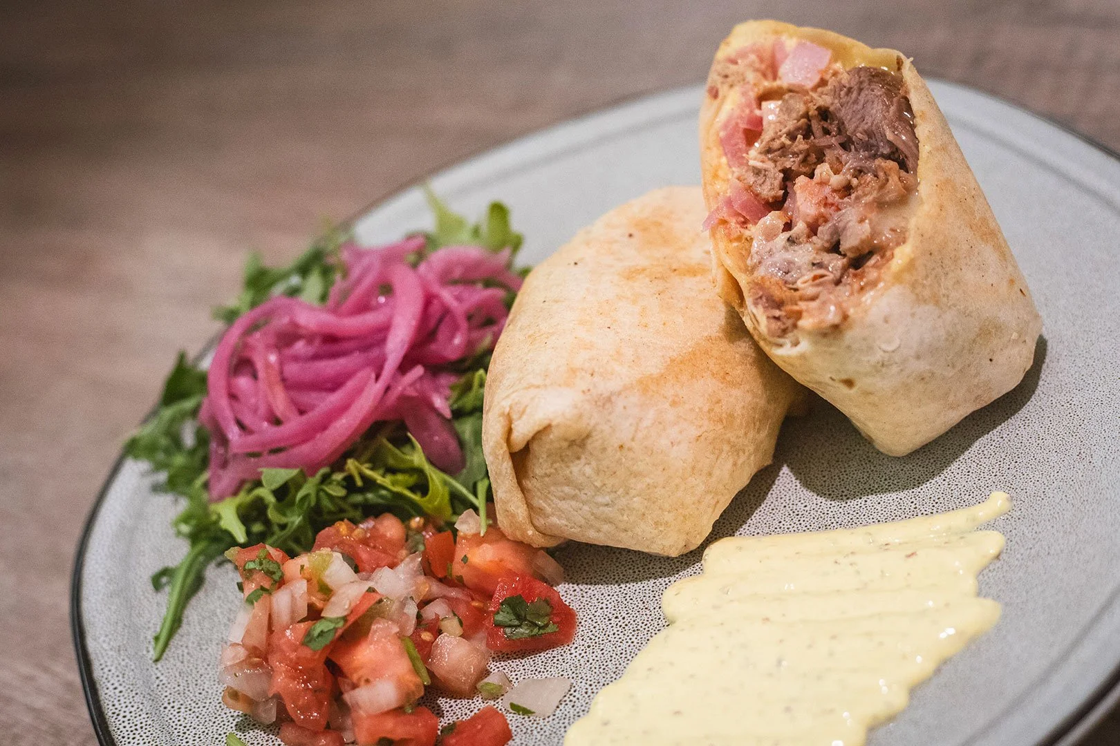 slow roasted pork, diced ham, jack cheese, pickled red onion, grain mustard crema / 17