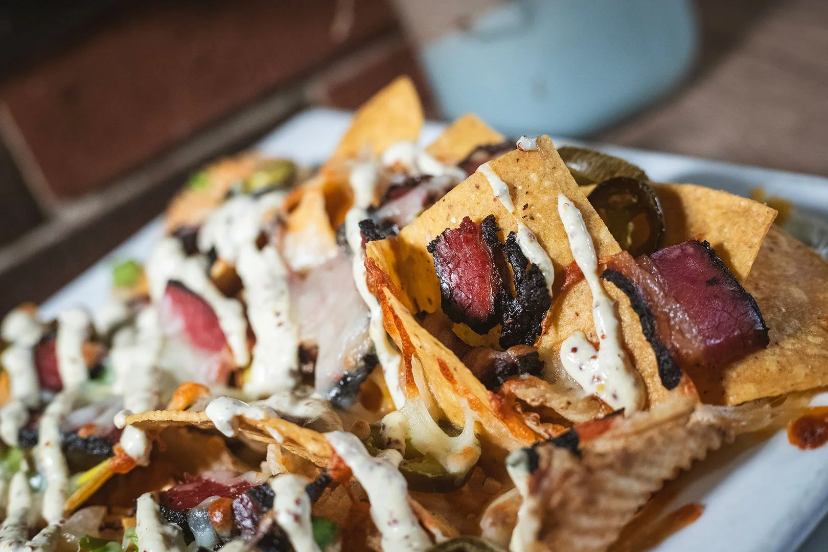 airy whipped sour cream, crushed smokehouse almonds, ghost chili sauce